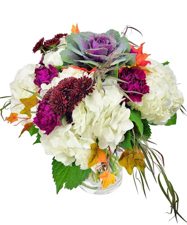 It features an assortment of vibrant kale, lush hydrangea, cheerful carnations, fluffy poms, and lush greenery. The addition of faux fall leaves adds a touch of realism to the bouquet, making it the perfect centerpiece for your home or office. Whether you're celebrating the season or simply adding a pop of color to your space, this arrangement will bring warmth and joy to any room.