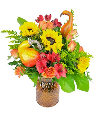 A sweet fall arrangement featuring solidago, faux gourds, alstroemeria, sunflowers and greens in a rustic textured jar.