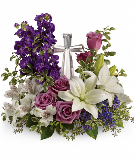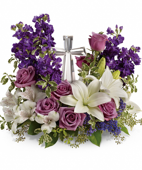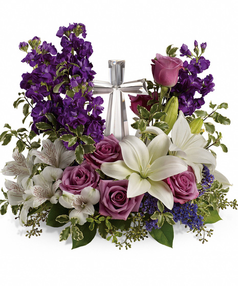 A bouquet to remember. This glorious garden of roses, lilies and alstroemeria surrounds a gleaming Crystal Cross. It's a radiant, reverent expression of faith that will be appreciated for years to come.
