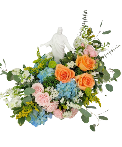 Jesus statue surrounded by colorful blooms.