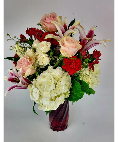 A mix of lilies, roses, carnations, and hydrangea in a red vase.