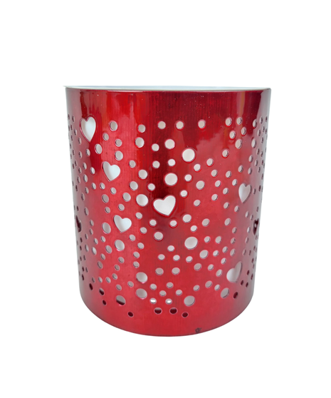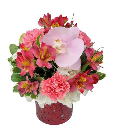 A mix of alstroemeria, hydrangea, carnations and a cymbid orchid in a keepsake candle container.