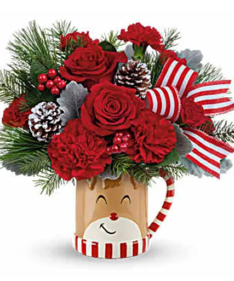 A mix of red roses, red carnations and mixed greens in a keepsake Christmas mug.
