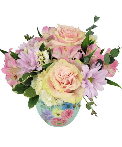 A low compact mix of hydrangea, roses, daises, alstroemeria and mixed greens in a keepsake metal water color vase.