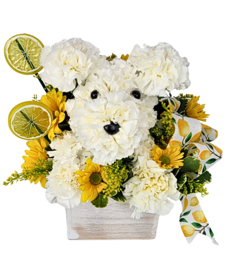 A dog made of carnations flowers with lemon accents.