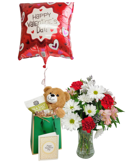 This Selection has it all!! It includes: Flowers, Candy, Balloon, Handmade Card and Plush!