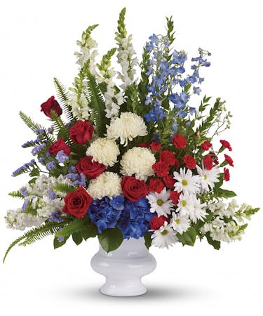 A dazzling display of patriotic red, white and blue flowers sends a silent yet poignant statement about hope, freedom and the strength to endure. This proud bouquet is a testament to life that is sure to be appreciated.