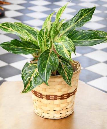 Whether you're looking to bring a touch of the outdoors inside, or simply want to add a pop of greenery to your home or office, the Aglaonema in a basket is a great choice.