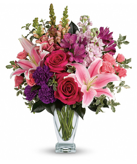 Hand-delivered in a shapely glass vase, this sumptuous arrangement of roses and lilies is a lavish way to celebrate a special day - or surprise someone just because!